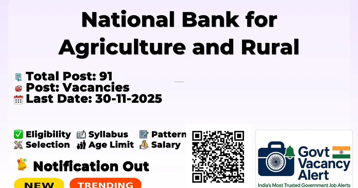 Company Name National Bank for Agriculture and Rural Development (NABARD) Post Name Officers Grade A No of Posts 91 Pay Matrix As per Grade A scale (Approx. Rs. 44,500 – Rs. 89,150 per month) Qualification Any Bachelors Degree, LLB, Any Masters Degree, CA, CS, PG Diploma Age Limit 21 to 30 years Start Date for Apply Online 08-11-2025 Last Date for Apply Online 30-11-2025 Official Website nabard.org