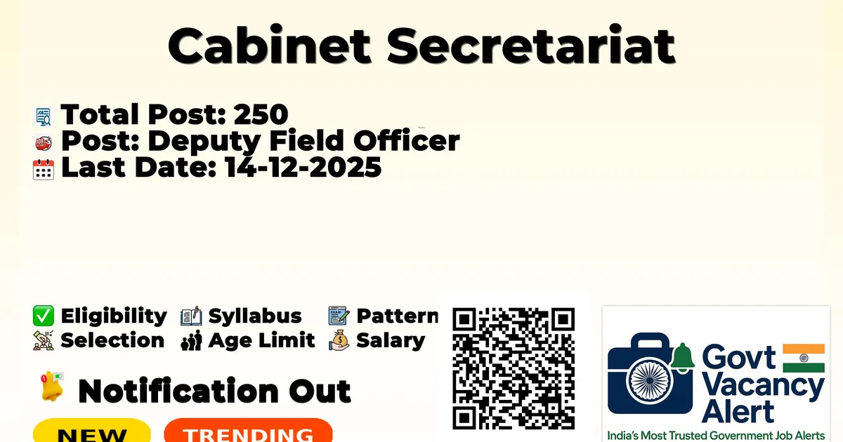Company Name Cabinet Secretariat Post Name Deputy Field Officer No of Posts 250 Salary Rs. 99,000 Qualification B.Tech/B.E, M.Sc Age Limit 30 years Start Date for Apply Available Soon Last Date for Apply 14-12-2025 Official Website cabsec.gov.in
