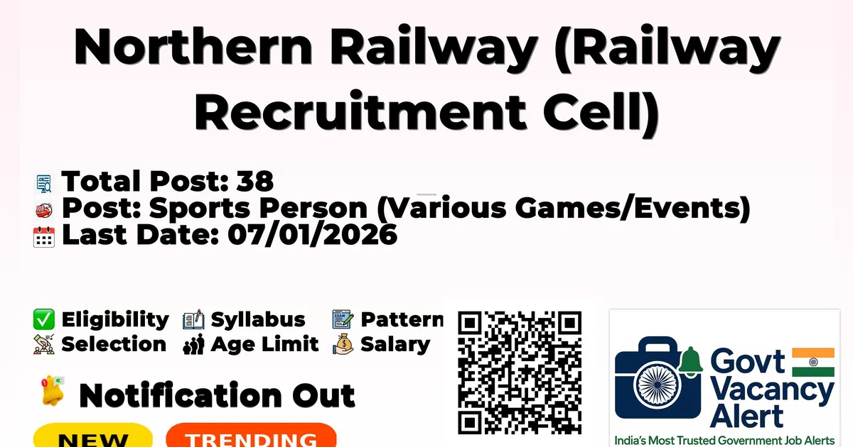 RRC Northern Railway has released an official notification for the recruitment of 38 Sports Persons Posts. Interested and eligible candidates can apply Online through the official RRC Northern Railway website. The last date to submit the application form is 07-01-2026. In this article, you’ll find the RRC Northern Railway Sports Persons Posts recruitment details, including eligibility criteria, age limit, salary structure, selection process, application steps, and direct links to the official notification and Online application form.