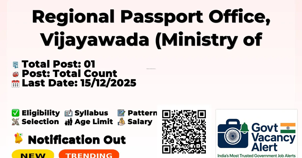 Regional Passport Office Vijayawada has released an official notification for the recruitment of 01 Young Professional Posts. Interested and eligible candidates can apply Offline through the official Regional Passport Office Vijayawada website. The last date to submit the application form is 15-12-2025. In this article, you’ll find the Regional Passport Office Vijayawada Young Professional Posts recruitment details, including eligibility criteria, age limit, salary structure, selection process, application steps, and direct links to the official notification and Offline application form.