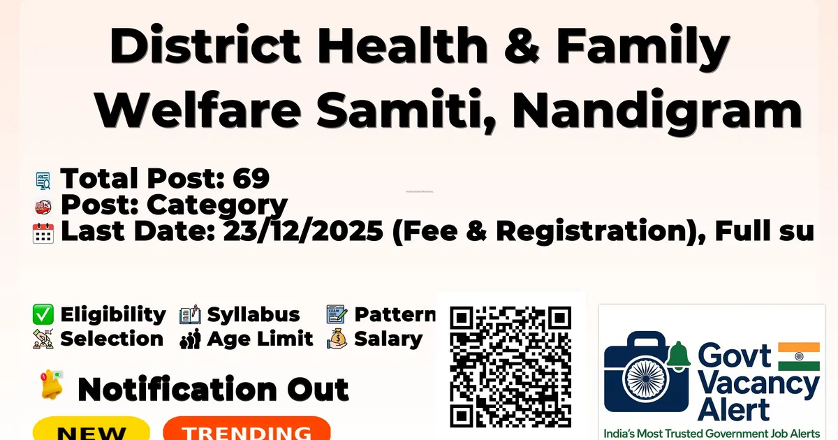 Company Name District Health & Family Welfare Samiti, Nandigram Health District (DHFWS Nandigram) Post Name Community Health Officer (CHO) No of Posts 69 Salary ₹20,000/- per month + maximum ₹5,000/- Performance Linked Incentive (PLI) Qualification B.Sc Nursing with Integrated BPCCHN (2021 onwards) OR GNM/Post Basic B.Sc/B.Sc Nursing (before 2021) OR BAMS Age Limit Maximum 40 years as on 01-04-2025 (Relaxation as per Govt. norms) Start Date for Apply 09/12/2025 (11:00 AM) Last Date for Apply 23/12/2025 (Fee & Registration), Full submission upto Midnight 24/12/2025 Official Website www.wbhealth.gov.in
