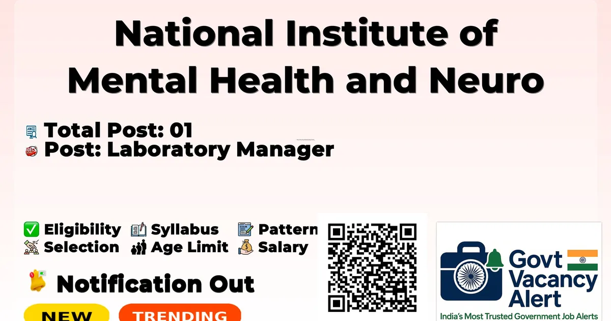 National Institute of Mental Health and Neuro Sciences (NIMHANS) Recruitment 2026 for 01 posts of Laboratory Manager. Candidates with M.Sc Can attend the walkin. The Walk-in starts from Available Soon, and ends on 12-01-2026. For detailed information please visit NIMHANS official website, nimhans.ac.in.