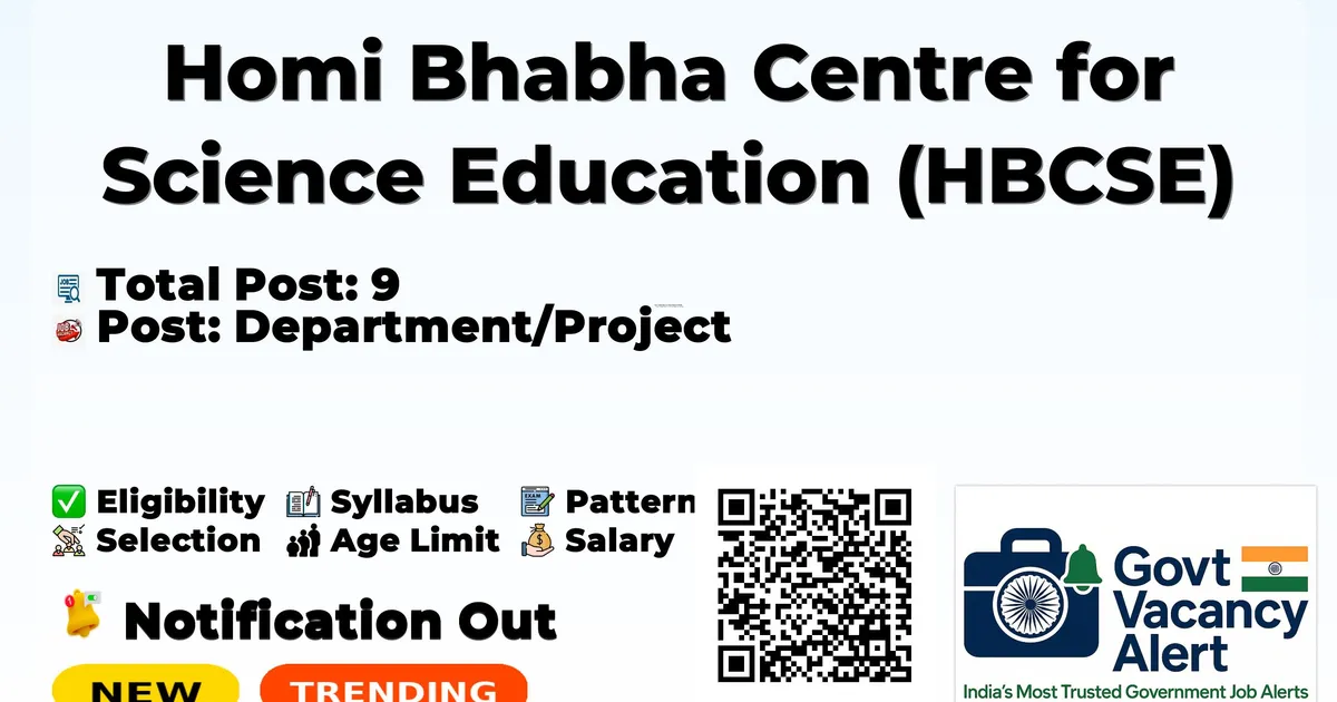 Company Name Homi Bhabha Centre for Science Education (HBCSE) Post Name Project Scientific Assistant - B, Project Assistant, Technical Trainee, Technical Trainee (Civil), Clerk Trainee No of Posts 9 Salary Rs. 22000/- to Rs. 63900/- Per Month Qualification B.Sc., Graduate, Diploma in Engineering Age Limit 28 to 31 years Walk-in Date 12/01/2026 to 20/01/2026 (post-wise) Official Website hbcse.tifr.res.in