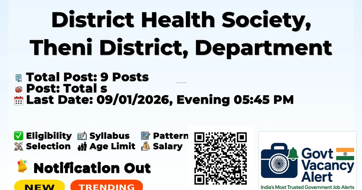 Company Name District Health Society, Theni District, Department of Health and Family Welfare (DHS Theni) Post Name RMNCH Counsellor, Pharmacist, Health Inspector, Staff Nurse, MPHW, Lab Technician No of Posts 9 Posts Salary Rs. 8,500 - Rs. 18,000 Per Month Qualification 8th Pass to Master's Degree (varies by post) Age Limit Below 40 Years Last Date for Apply 09/01/2026, Evening 05:45 PM Official Website https://theni.nic.in