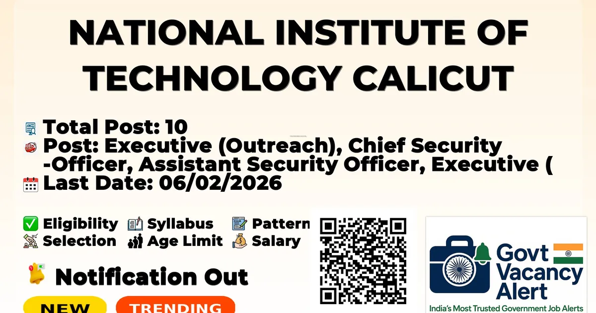National Institute of Technology Calicut (NIT Calicut) has released an official notification for the recruitment of 10 Executive, Software Developer and Other Posts. Interested and eligible candidates can apply Online through the official NIT Calicut website. The last date to submit the application form is 06-02-2026. In this article, you’ll find the NIT Calicut Executive, Software Developer and Other Posts recruitment details, including eligibility criteria, age limit, salary structure, selection process, application steps, and direct links to the official notification and Online application form.