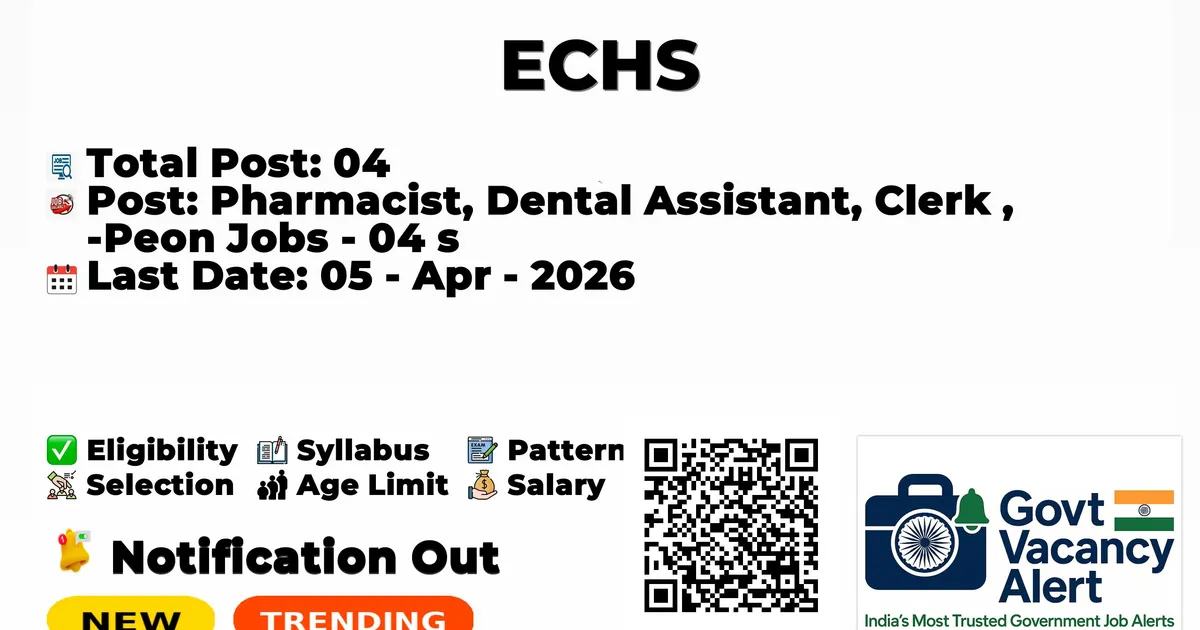 Ex-Servicemen Contributory Health Scheme (ECHS) has announced the official notification for 04 Pharmacist, Dental Assistant, Clerk, and Peon Jobs. Those candidates who have qualified in the B.Pharm, BDS, or any degree can grab this chance and apply for the ECHS Recruitment 2026. Here we include the age limit, selection process, salary structure, education details, and application fee. and how to apply for these posts.