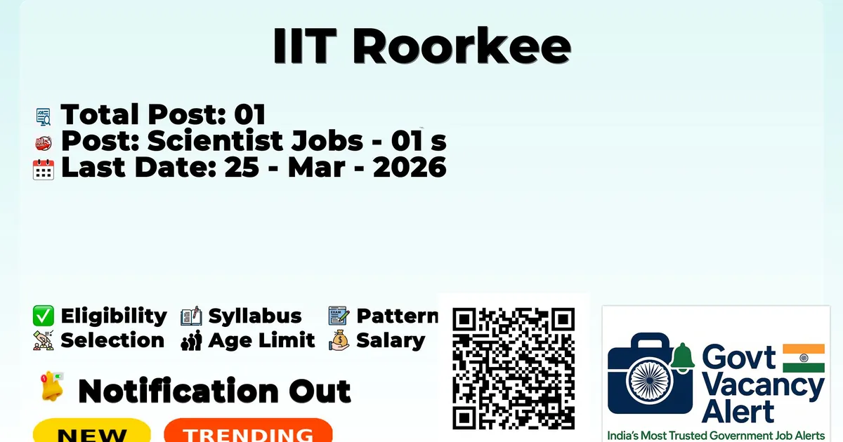 Indian Institute of Technology Roorkee (IIT Roorkee) has declared the latest job notification for 2026. To fill up the vacancies for various Scientist Jobs. Those candidates who have qualified in the Post Graduation, Ph.D can grab this chance and apply for the IIT Roorkee Notification 2026. Here we provided more about the age limit, selection process, salary structure, education details, application fee, and how to apply for these posts.