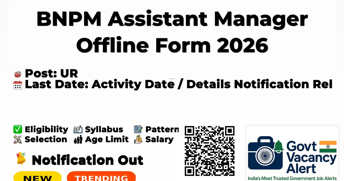 Particulars Details Organisation Bank Note Paper Mill India Private Limited (BNPMIPL) Notification No. 02/2026 Dtd. 06.03.2026 Post Name Assistant Manager (Finance & Accounts, Materials Management, Civil) Total Vacancies 06 Posts Pay Level Level 8 (Equivalent to Central Govt. Pay) – Minimum Basic Pay ₹52,000/- Maximum Age Limit 32 years (as on 11.04.2026) Experience Required Not Essential (Freshers eligible) Application Fee (General/OBC) ₹800/- (DD in favour of "BNPM Recruitment Account" payable at Mysuru) Application Fee (SC/ST/PwBD/Ex-Servicemen) Nil Application Mode Offline (by post) only Last Date to Apply 11 April 2026 by 17:00 hrs Selection Process Offline/Online Test (Objective) + Personal Interview Exam Centre Bangalore and/or Mysuru Job Location Mysuru, Karnataka (or any other place as per company requirement) Official Website www.bnpmindia.com