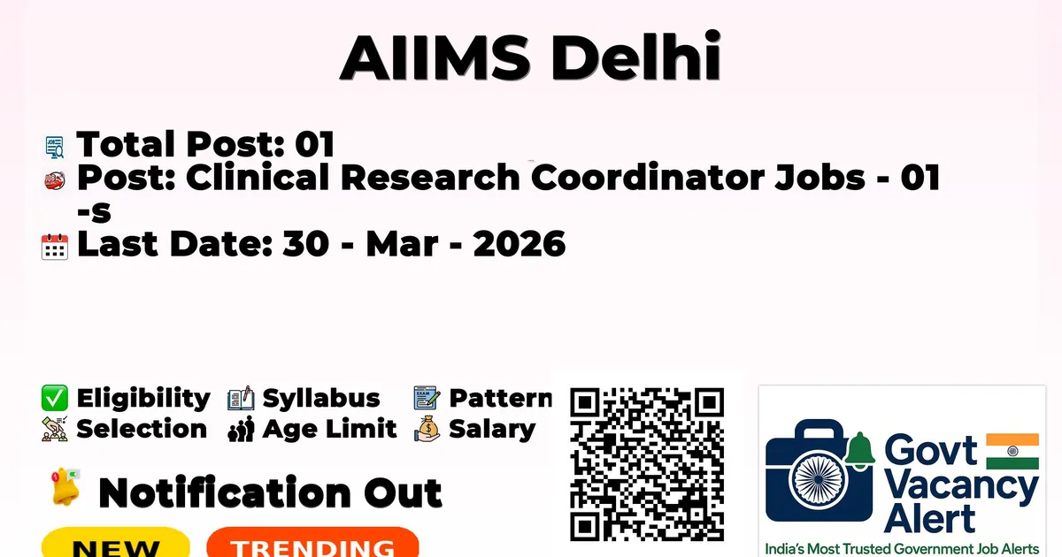 The All India Institute of Medical Sciences, Delhi (AIIMS Delhi) has officially released the notification to fill the vacancies of 01 Clinical Research Coordinator Posts. Interested and eligibile candidates can use this opportunity to apply for these posts before the last date of application. Candidates who have completed their Any Degree and Post-graduation can apply for the AIIMS Delhi Jobs 2026. The interested applicants can apply in offline mode. Here we have mentioned the education details, age limit, selection process, application fee, salary, and how to apply for these posts before the deadline. The application dates have already begun.
