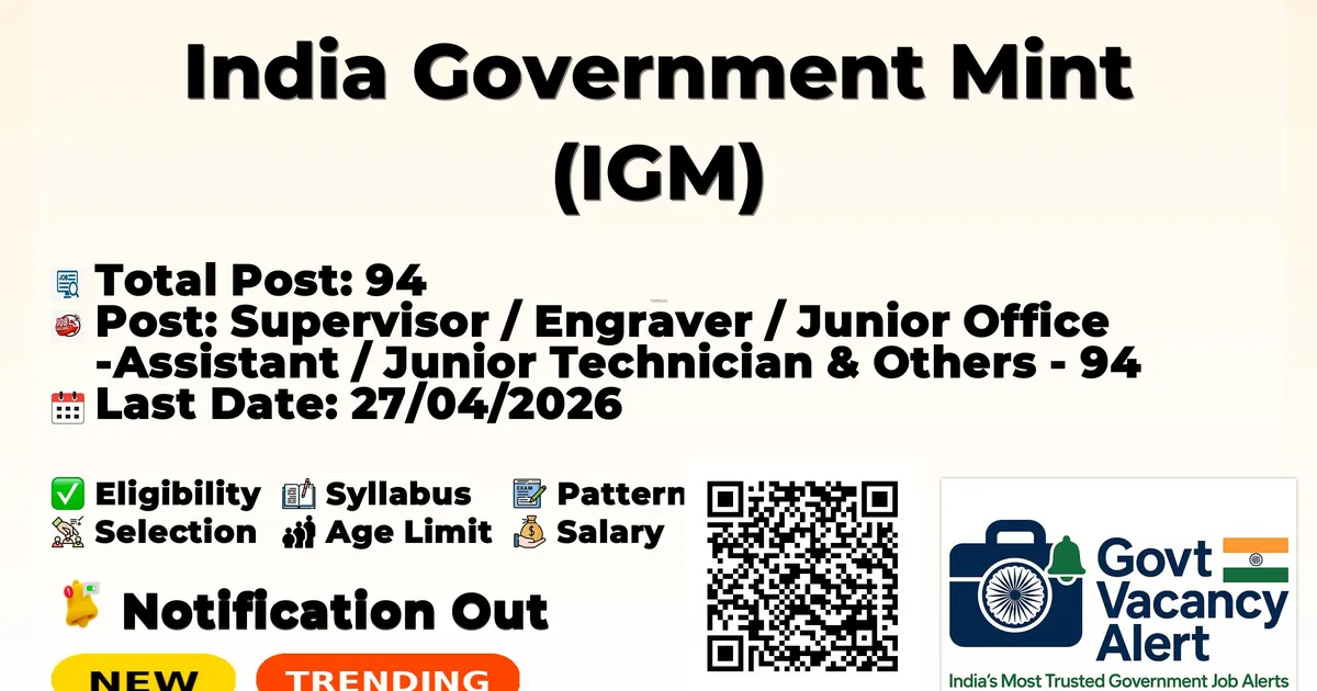 India Government Mint (IGM) (A Unit of Security Printing and Minting Corporation of India Limited – SPMCIL), Wholly Owned by Government of India, Noida has invited online applications from eligible candidates for recruitment of 94 various posts of Supervisor, Engraver, Junior Office Assistant, Junior Bullion Assistant, Junior Hindi Typist, Laboratory Assistant and Junior Technician in different trades on regular basis. Eligible candidates are strongly advised to carefully read the detailed official notification before applying online to confirm eligibility regarding age, qualification, experience, category, reservation, and other criteria. The IGM Recruitment 2026 for 94 Vacancies Online Registration process starts from 28th March 2026 and closes on 27th April 2026.