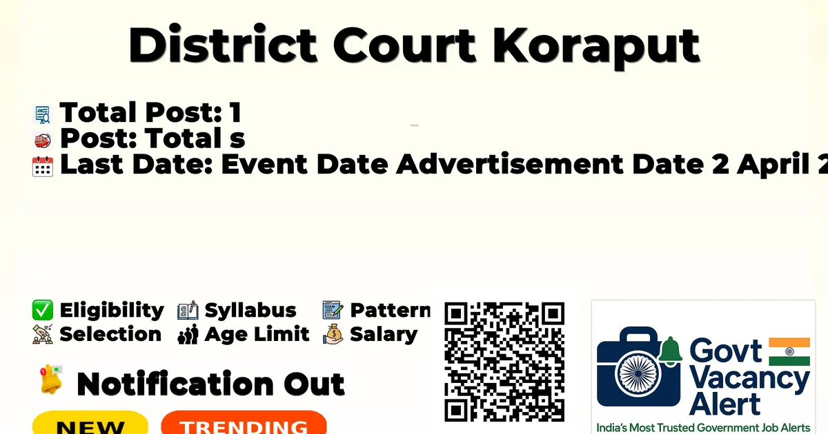 District Court Koraput Counsellor Notification 2026 has been released on 02 April 2026 on the official website koraput.dcourts.gov.in. A total of 1 vacancy has been announced through the District Court Koraput Counsellor Recruitment 2026.