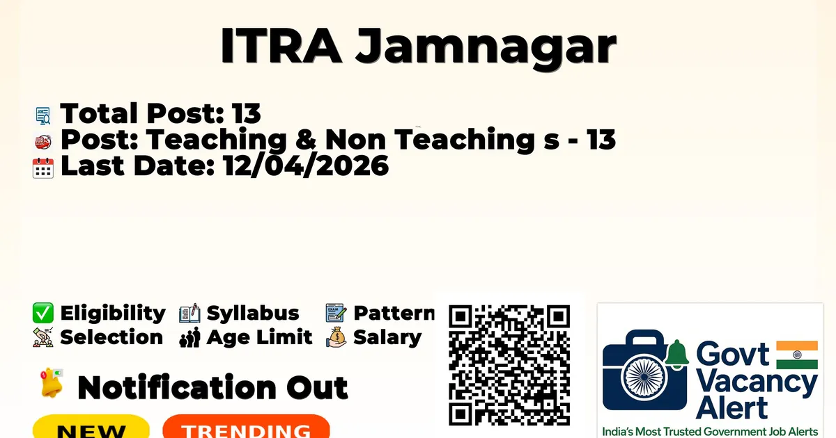 Institute of Teaching & Research in Ayurveda (ITRA), Jamnagar, an Institute of National Importance under the Ministry of Ayush, Government of India, has invited applications for direct recruitment to 13 Teaching and Non-Teaching posts on regular basis. Eligible candidates are strongly advised to carefully read the detailed official notification before applying to confirm eligibility regarding age, qualification, experience, category, reservation, and other criteria. The ITRA Jamnagar Recruitment 2026 for 13 Vacancies Application process is open and the last date for receipt of hard copy is 12th April 2026. Applications must be sent by Registered Post / Speed Post only.