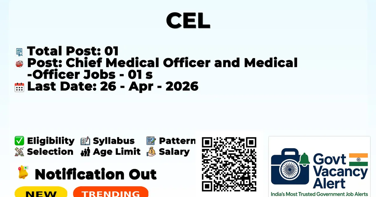 Central Electronics Limited (CEL) has declared the official notification for 2026. To fill up the vacancies for various Chief Medical Officer and Medical Officer Jobs. Those candidates who have qualified for MBBS can grab this opportunity and apply for the CEL Recruitment 2026. Here, we included the age limit, selection process, salary structure, education details, application fee, and how to apply for these posts.