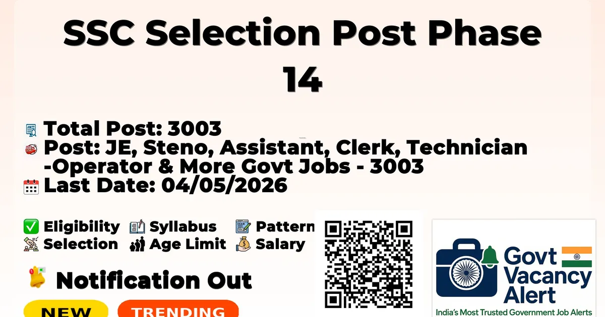 Staff Selection Commission (SSC), has released the notification for the SSC Selection Post Phase 14 Notification 2026. This recruitment drive will be conducted to fill 3003 Selection Post vacancies (various posts in different Ministries/Departments/Organizations of Government of India) at Matriculation, Higher Secondary (10+2) and Graduation & above levels. The SSC online application has started on 13 April 2026, and eligible candidates can apply until 04 May 2026 (up to 23:00 Hours). Candidates must check the complete details regarding eligibility, age limits, pay scale, educational qualification, and the application process for the SSC Selection Post Phase 14 Recruitment 2026 provided below.