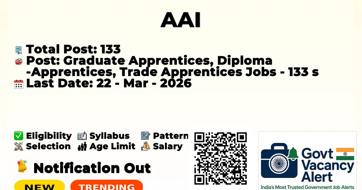The Airports Authority of India (AAI) has officially released the notification to fill the vacancies of 133 Graduate Apprentices, Diploma Apprentices, and Trade Apprentices. Interested and eligibile candidates can use this opportunity to apply for these posts before the last date of application. Candidates who have completed their Diploma, B.E./B. Tech in Mechanical, Electrical, Electronics, Civil Engineering, 10th, ITI can apply for the AAI Notification 2026. The interested applicants can apply in online mode. Here we have mentioned the education details, age limit, selection process, application fee, salary, and how to apply for these posts before the deadline. The application dates have already begun.