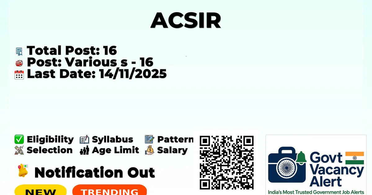 The Academy of Scientific & Innovative Research (AcSIR), an Institution of National Importance and India's largest higher education institution for Doctoral Research, invites applications from highly motivated and qualified candidates for 16 various administrative positions under Advertisement No. 01/2025. These roles span Administration & Finance, Academics, and support across AcSIR Headquarters and CSIR labs, offering a chance to contribute to scientific innovation and higher education. The AcSIR Recruitment 2025 application process requires submission via email in the prescribed format. Interested candidates should review the detailed notification before applying. Last date for receipt of applications is 14th November 2025. www.indgovtjobs.in Job Title Various Administrative Positions Total Vacancies 16 Age Limit Varies (35 to 57 years) Monthly Salary Rs. 35,400 – Rs. 2,18,200 + Allowances Minimum Qualification Bachelor’s/Master’s Degree Selection Process Shortlisting & Interview Job Location Ghaziabad, Roorkee, Lucknow, New Delhi Last Date 14/11/2025 Name of the Position No. of Posts (Reservation) Assistant Director (Administration & Finance) 01 (General) Senior Manager (Administration & Finance -1; Academics -1) 02 (General) Manager 02 (General) Assistant Manager 04 (3 General + 1 OBC) Executive Assistant for AcSIR HQs., Ghaziabad 04 (3 General + 1 OBC) Executive Assistant for CSIR-CBRI, Roorkee 01 (General) Executive Assistant for CSIR-CIMAP, Lucknow 01 (General) Executive Assistant for CSIR-NIScPR, New Delhi 01 (SC) Assistant Director: Below 57 years Senior Manager/Manager: 50 years Assistant Manager: 40 years Executive Assistant: 35 years Age relaxation as per Government of India rules for SC/ST/OBC/PwBD/Ex-Servicemen.
