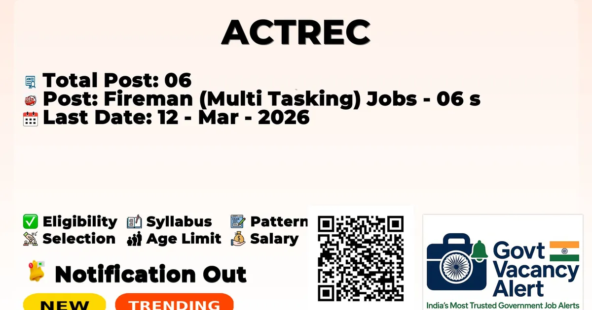 The Advanced Centre for Treatment Research and Education in Cancer (ACTREC) has published the official notification for 2026. To fill up the vacancies for 06 Fireman (Multi-Tasking) Jobs. Those candidates who have qualified in the Intermediate (10+2) can use this chance and apply for the ACTREC Recruitment 2026. Here, we included the age limit, selection process, salary structure, education details, application fee, and how to apply for these posts.