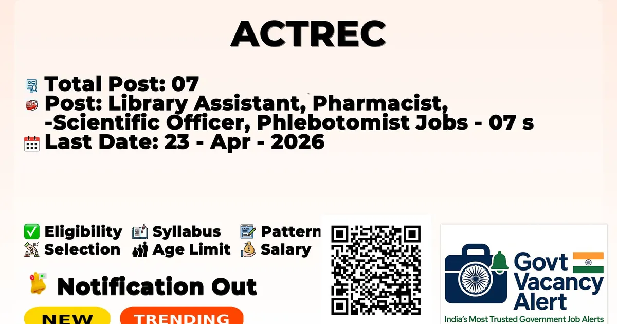The Advanced Centre for Treatment, Research and Education in Cancer (ACTREC) has declared the official notification for 2026. To fill up the vacancies for 07 Library Assistant, Pharmacist, Scientific Officer, and Phlebotomist Jobs. Those candidates who have qualified in the Any Degree, B.Pharm, D.Pharm, B.Sc, M.Sc can grab this chance and apply for the ACTREC Notification 2026. Here we included more details about the age limit, selection process, salary structure, education details, application fee, and how to apply for these posts.