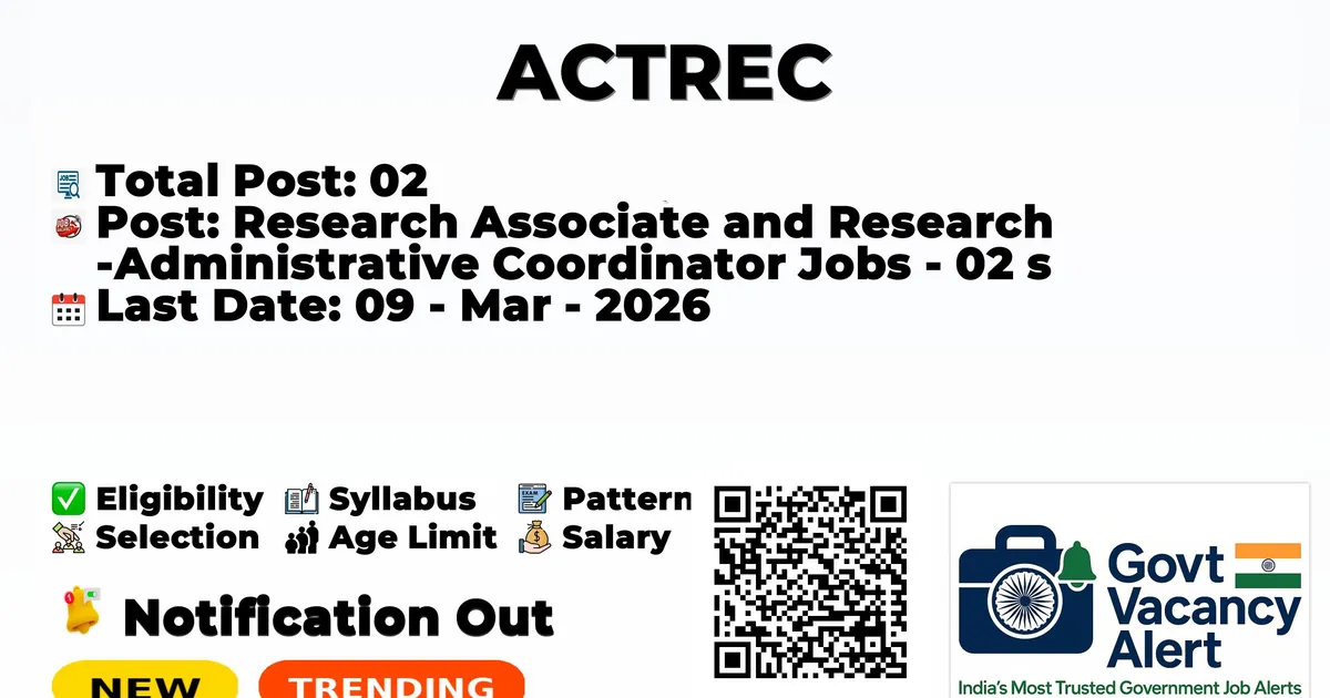 The Advanced Centre for Treatment Research and Education in Cancer (ACTREC) has declared the latest job notification for 02 Research Associate and Research Administrative Coordinator Jobs. Candidates who have qualified in the M.Sc, MBBS, BDS, Post Graduation, Pharm D, M.Pharm, M.E/ M.Tech can grab this chance and apply for the ACTREC Notification 2026. Here, we included the age limit, selection process, salary structure, education details, application fee, and how to apply for these posts. Interested candidates can attend the walk-in at the address below.