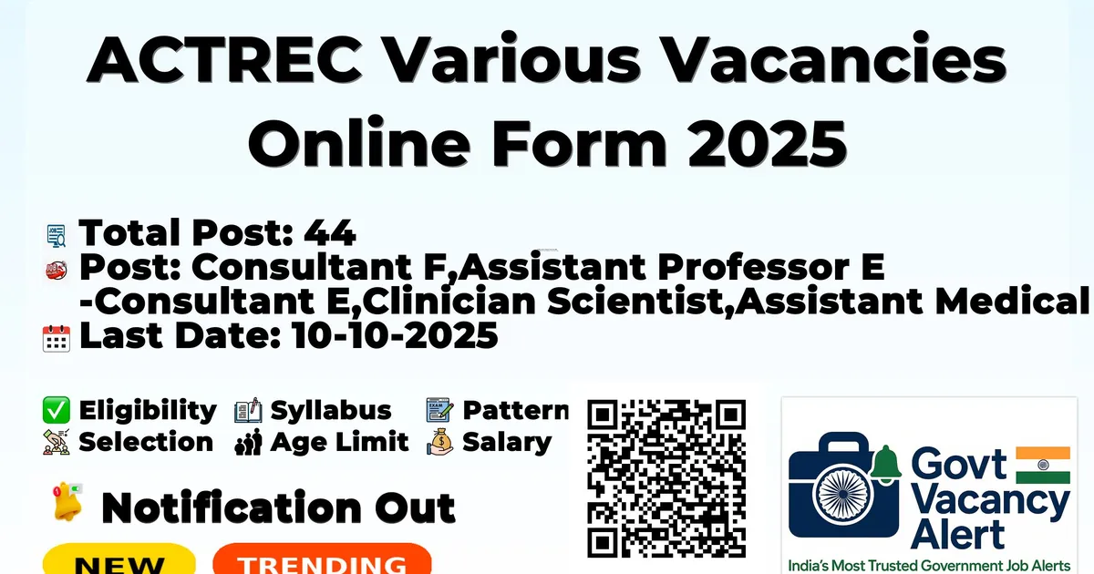 The Advanced Centre for Treatment Research and Education in Cancer (ACTREC) Recruitment 2025 for 44 posts of Consultant, Assistant Professor and More. Candidates with BDS, MBBS, DNB, MS, MS/MD, MHA, M.Ch, DM Can Apply Online. The online application opens on 10-09-2025, and closes on 10-10-2025. The candidate shall apply online through ACTREC website, actrec.gov.in. The ACTREC Consultant, Assistant Professor and More Recruitment 2025 Notification PDF has been released on 10-09-2025 at actrec.gov.in. Check the complete job details, vacancy, age limit, application fee, selection process and how to apply from the article. You can Check all Latest Sarkari Result Updates of All Central Government Jobs and State Government Jobs. ACTREC Consultant, Assistant Professor and More Recruitment 2025 Notification PDF