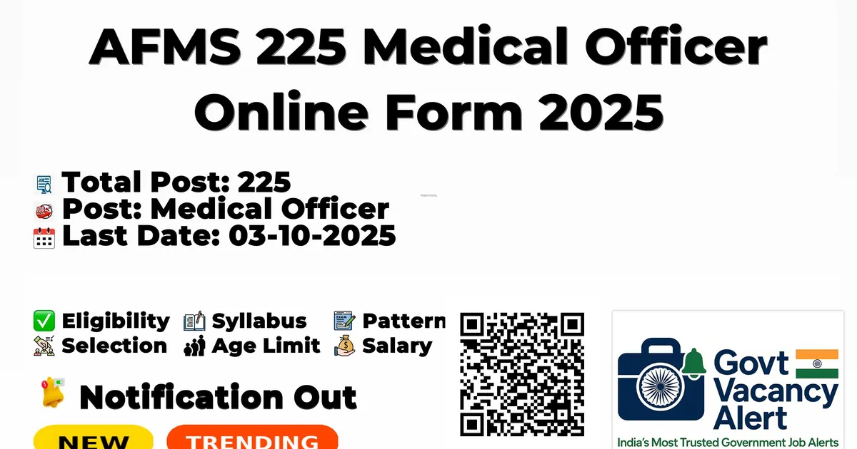 The Armed Forces Medical Services (AFMS) Recruitment 2025 for 225 posts of Medical Officer. Candidates with MBBS, MS/MD Can Apply Online. The online application opens on 13-09-2025, and closes on 03-10-2025. The candidate shall apply online through AFMS website, join.afms.gov.in.