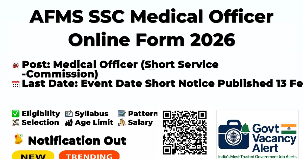 Armed Forces Medical Services (AFMS) has released an official notification for the recruitment of 100 SSC Medical Officer Posts. Interested and eligible candidates can apply Online through the official AFMS website. The last date to submit the application form is 04-03-2026. In this article, you’ll find the AFMS SSC Medical Officer Posts recruitment details, including eligibility criteria, age limit, salary structure, selection process, application steps, and direct links to the official notification and Online application form.