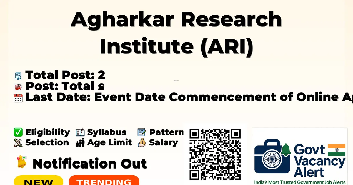 Company Name Agharkar Research Institute (ARI) Post Name Hindi Typist No of Posts 2 Advertisement No RecT/HT/01/2025-26 Salary Rs. 25,500/- Fixed Monthly Stipend Qualification Graduation with Hindi/English as compulsory/elective subject or medium of examination at Degree level Age Limit Maximum 28 years as on closing date (5 years relaxation for SC/ST, 3 years for OBC) Notification Date 13-02-2026 Last Date 24-02-2026 Website https://aripune.res.in