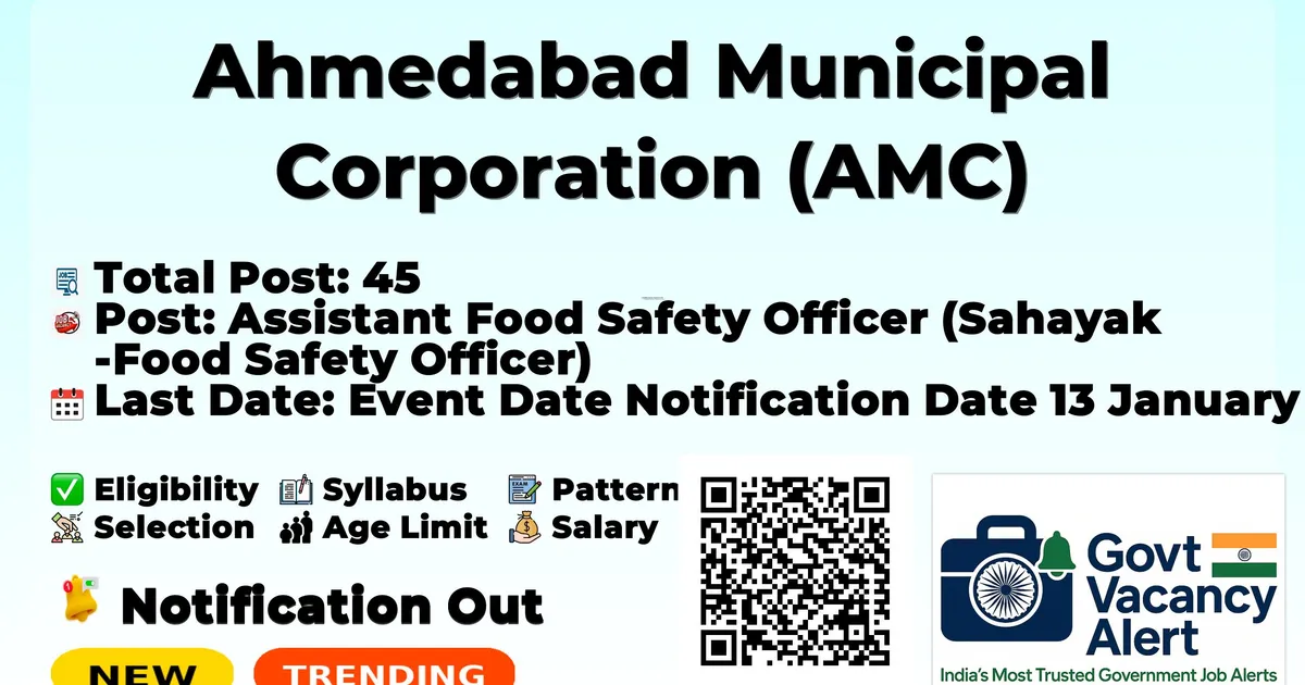 Ahmedabad Municipal Corporation (AMC) has released an official notification for the recruitment of 45 Assistant Food Safety Officer Posts. Interested and eligible candidates can apply Online through the official AMC website. The last date to submit the application form is 27-01-2026. In this article, you’ll find the AMC Assistant Food Safety Officer Posts recruitment details, including eligibility criteria, age limit, salary structure, selection process, application steps, and direct links to the official notification and Online application form.