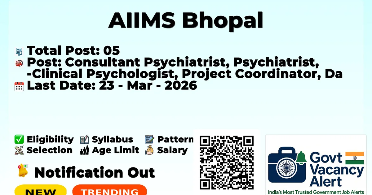 The All India Institute of Medical Sciences, Bhopal (AIIMS Bhopal) has officially released the notification to fill the vacancies of 05 Consultant Psychiatrist, Psychiatrist, Clinical Psychologist, Project Coordinator, and Data Entry Operator Jobs. Interested and eligibile candidates can use this opportunity to apply for these posts before the last date of application. Candidates who have completed their MD/MS, DNB, Diploma, B.E./B. Tech, M.Sc., MCA can apply for the AIIMS Bhopal Jobs 2026. The interested applicants can attend the walk-in interview. Here we have mentioned the education details, age limit, selection process, application fee, salary, and how to apply for these posts before the deadline. The application dates have already begun.