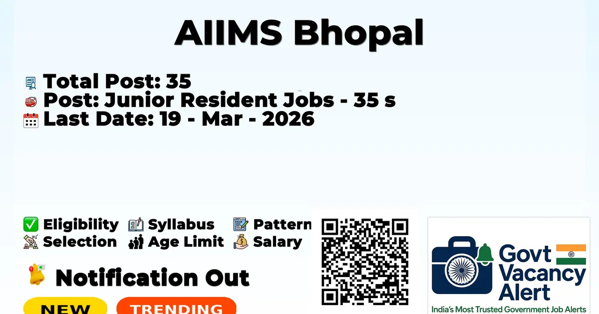 All India Institute of Medical Sciences, Bhopal (AIIMS Bhopal) has officially announced a Walk-in Interview for the recruitment of 35 Junior Resident Posts. Candidates who have qualified in the MBBS can grab this chance and apply for the AIIMS Bhopal Recruitment 2026. Here we included the age limit, selection process, salary structure, education details, application fee, and how to apply for these posts. Interested and eligible candidates can attend the walk-in at the address below.