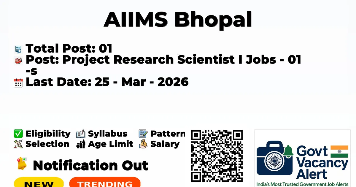 All India Institute of Medical Sciences Bhopal (AIIMS Bhopal) has released the official notification for 2026. To fill up the various vacancies for Project Research Scientist I Jobs. Those candidates who have qualified in the Post Graduation, Ph.D can grab this chance and apply for the AIIMS Bhopal Recruitment 2026. Here we included the age limit, selection process, salary structure, education details, application fee, and how to apply for these posts.