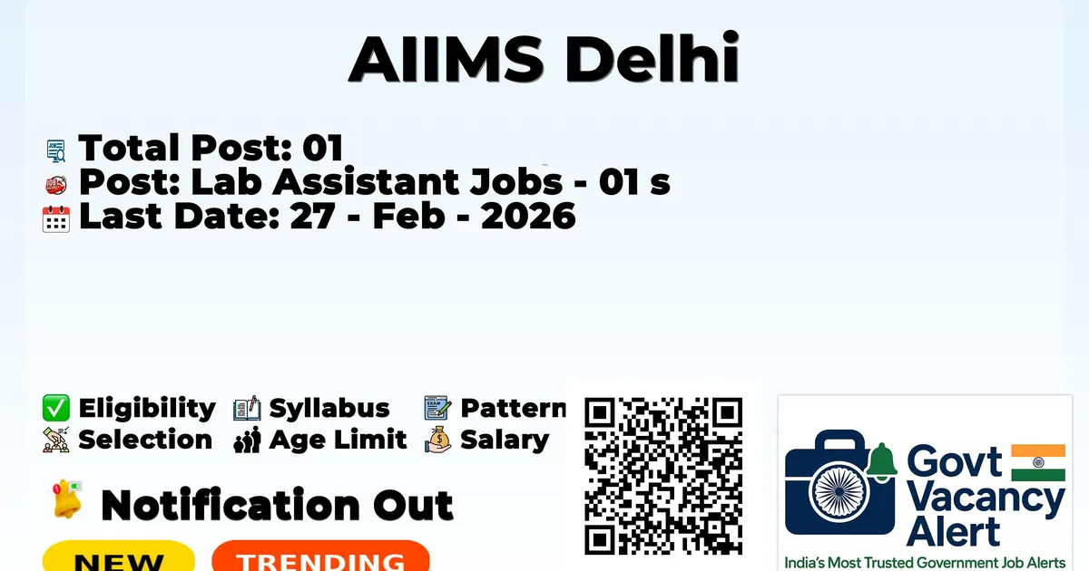 The All India Institute of Medical Sciences, Delhi (AIIMS Delhi) has officially released the notification to fill the vacancies of 02 Lab Assistant Posts. Interested and eligibile candidates can use this opportunity to apply for these posts before the last date of application. Candidates who have completed their Any Degree or 12th can apply for the AIIMS Delhi Jobs 2026. The interested applicants can apply in offline mode. Here we have mentioned the education details, age limit, selection process, application fee, salary, and how to apply for these posts before the deadline. The application dates have already begun.