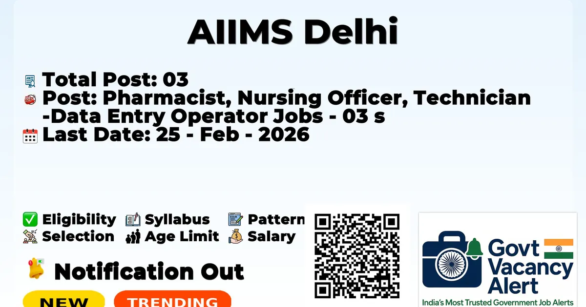 The All India Institute of Medical Sciences, Delhi (AIIMS Delhi) has officially released the notification to fill the vacancies of 03 Pharmacist, Nursing Officer, Technician, and Data Entry Operator Jobs. Interested and eligibile candidates can use this opportunity to apply for these posts before the last date of application. Candidates who have completed their B. Pharm, D. Pharm, GNM, B.Sc Nursing, 12th, and B.Sc. can apply for the AIIMS Delhi Jobs 2026. The interested applicants can apply in online mode. Here we have mentioned the education details, age limit, selection process, application fee, salary, and how to apply for these posts before the deadline. The application dates have already begun.