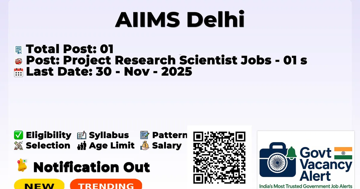 All India Institute of Medical Sciences, Delhi (AIIMS Delhi) has declared the official notification for 2025. To fill up the vacancies for Project Research Scientist Jobs. Those candidates who have qualified in the MBBS, M.V.Sc, and BDS can grab this chance and apply for the AIIMS Delhi Recruitment 2025. Here, we include the age limit, selection process, salary structure, education details, application fee, and how to apply for these posts. Interested candidates can apply before the last date of application.