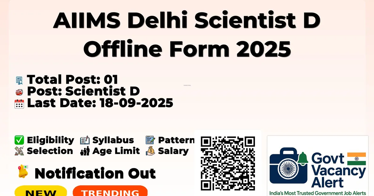 The All India Institute Of Medical Sciences Delhi (AIIMS Delhi) Recruitment 2025 for 01 posts of Scientist D. Candidates with Masters Degree, M.Phil/Ph.D Can Apply Offline. The Offline application opens on 08-09-2025, and closes on 18-09-2025. The candidate shall apply Offline through AIIMS Delhi website, aiims.edu.