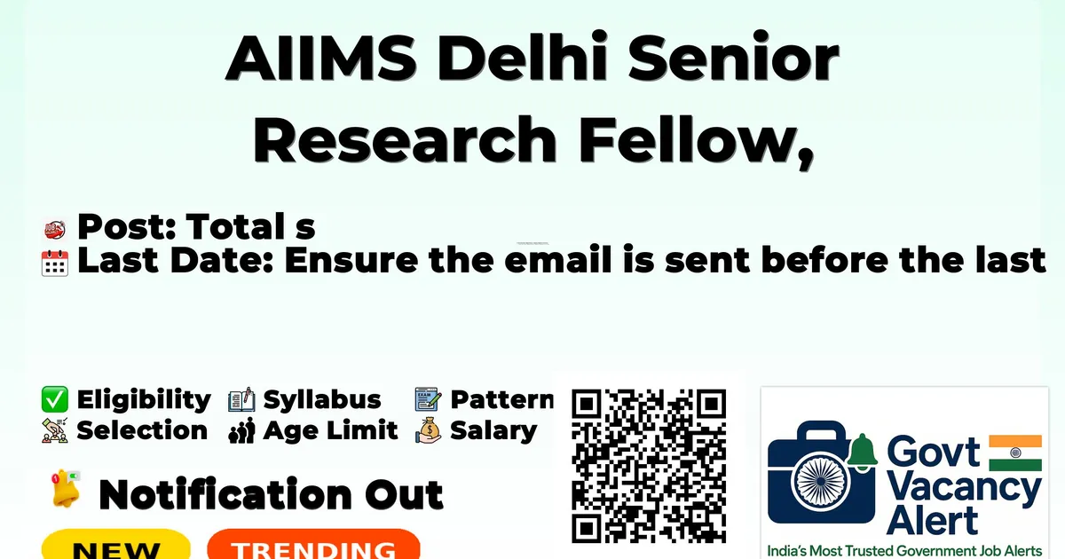 All India Institute of Medical Sciences Delhi (AIIMS Delhi) has released an official notification for the recruitment of 02 Senior Research Fellow, Laboratory Technician Posts. Interested and eligible candidates can apply Online through the official AIIMS Delhi website. The last date to submit the application form is 04-03-2026. In this article, you’ll find the AIIMS Delhi Senior Research Fellow, Laboratory Technician Posts recruitment details, including eligibility criteria, age limit, salary structure, selection process, application steps, and direct links to the official notification and Online application form. Advertisement Organization Name All India Institute of Medical Sciences, New Delhi Post Name Senior Research Fellow / Laboratory Technician Number of Posts 2 Qualification M.Sc, B.Sc, B.Tech/B.E Notification Date 18-02-2026 Last Date for Application 04-03-2026 Website https://www.aiims.edu Trending Govt Jobs MMRDA 235 AE, JE and More Posts Online Form 2026 RRB 22000 Group D Online form 2026 RBI 650 Assistant Online Form 2026 Aadhaar Operator Supervisor Online Form 2026 Indian Army Agniveer Recruitment Rally Notification 2026 Candidates should download and read the AIIMS New Delhi Jobs 2026 notification PDF carefully to check vacancy details, eligibility, age limit, and application instructions. The notification also includes important dates and selection process details. The direct download link is available in the Important Links section below. Download AIIMS New Delhi Jobs 2026 Notification PDF - Click here Post Name Total Posts Senior Research Fellow 1 Laboratory Technician 1 Total 2 Senior Research Fellow: M.Sc. in Basic Sciences / Life Sciences with two years of research experience Laboratory Technician: B.Sc. / 3 Years Diploma in Engineering & Technology Senior Research Fellow: 35 Years Laboratory technician: 50 years Senior Research Fellow: As per DBT norms Laboratory Technician: As per DBT norms Event Date Notification Date 18 February 2026 Last Date for Application 4 March 2026 Shortlisting Interview Candidates who wish to apply for AIIMS New Delhi Various Posts Recruitment 2026 via email should follow the steps below. Read the official notification carefully before applying. Prepare your application with complete bio-data including personal details, educational qualifications, and experience. Attach self-attested copies of all required documents such as educational certificates, experience certificates, ID proof, and recent passport-size photographs. Clearly mention the post applied for in the subject line of the email. Send the complete application to the official email address mentioned in the notification. Ensure the email is sent before the last date: 04-03-2026. Keep a copy of the sent email for future reference. Link Description Link Official Notification PDF Click here Official Website Click here
