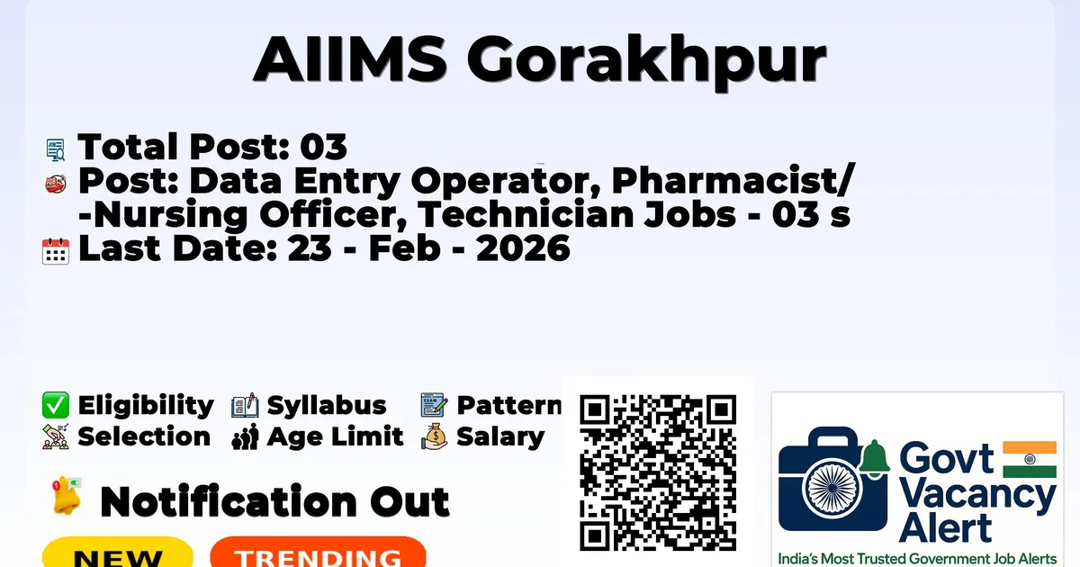 All India Institute of Medical Sciences Gorakhpur (AIIMS Gorakhpur) has released an official notification for the recruitment of 03 Data Entry Operator, Pharmacist/ Nursing Officer, Technician Jobs. Those candidates who have qualified in the B.Pharm, B.Sc Nursing, B.Sc, or any degree can grab this chance and apply for these posts. Here, we included the age limit, selection process, salary structure, education details, application fee, and how to apply for the AIIMS Gorakhpur Notification 2026. Interested candidates can apply before the last date.