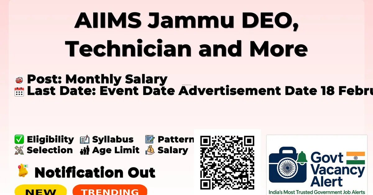 All India Institute of Medical Sciences Jammu (AIIMS Jammu) has released an official notification for the recruitment of 03 DEO, Technician and More Posts. Interested and eligible candidates can apply Online through the official AIIMS Jammu website. The last date to submit the application form is 26-02-2026. In this article, you’ll find the AIIMS Jammu DEO, Technician and More Posts recruitment details, including eligibility criteria, age limit, salary structure, selection process, application steps, and direct links to the official notification and Online application form.