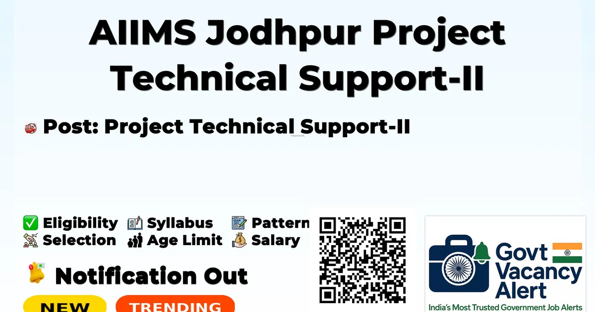 Details Information Organization Name All India Institute of Medical Sciences, Jodhpur (AIIMS Jodhpur) Post Name Project Technical Support-II Total Vacancies 1 Post Salary/Pay Scale Rs 20000 + HRA (per month) Educational Qualification 12th in Science + Diploma (MLT/DMLT/Engineering) + Five years' experience in relevant subject/field Age Limit Maximum 30 years (Age relaxation as per rules) Interview Date 09/12/2025 Application Mode Walk-in Interview Official Website www.aiimsjodhpur.edu.in