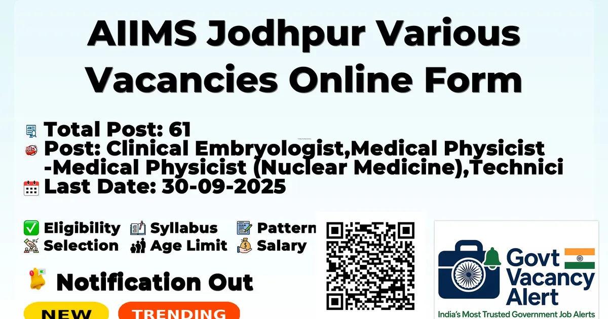 The All India Institute of Medical Sciences Jodhpur (AIIMS Jodhpur) Recruitment 2025 for 61 posts of Clinical Embryologist, Medical Physicist and More. Candidates with B.Sc, MBBS, Diploma, BVSC, Any Post Graduate, M.Sc Can Apply Online. The online application opens on 10-09-2025, and closes on 30-09-2025. The candidate shall apply online through AIIMS Jodhpur website, aiimsjodhpur.edu.in.