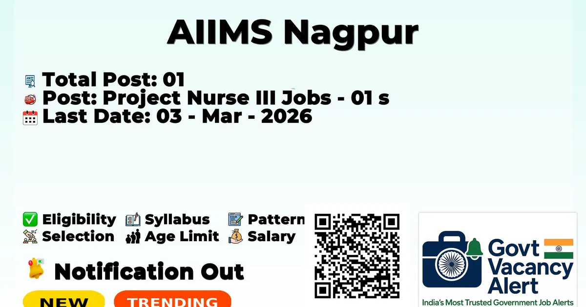 The All India Institute of Medical Sciences, Nagpur (AIIMS Nagpur) has officially released the notification to fill the vacancies of 01 Project Nurse III Posts. Interested and eligibile candidates can use this opportunity to apply for these posts before the last date of application. Candidates who have completed their B.Sc Nursing and M.Sc Nursing can apply for the AIIMS Nagpur Jobs 2026. The interested applicants can apply in online mode. Here we have mentioned the education details, age limit, selection process, application fee, salary, and how to apply for these posts before the deadline. The application dates have already begun.