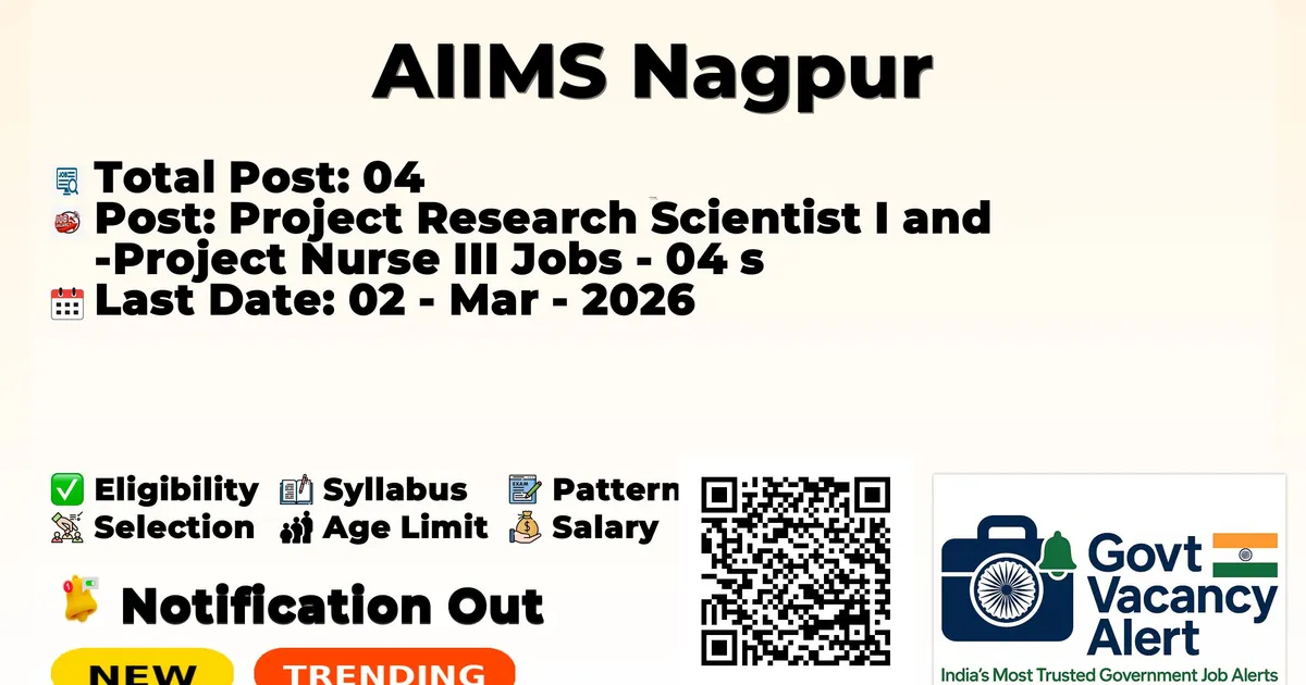 All India Institute of Medical Sciences, Nagpur has released the official notification for 4 Project Research Scientist - I and Project Nurse – III posts. Candidates who have qualified in the MBBS, BDS, BAMS, BHMS, GNM, and B.Sc Nursing can grab this chance and apply for the AIIMS Nagpur Notification 2026. Here we mentioned the age limit, selection process, salary structure, education details, application fee, and how to apply for these posts. Interested candidates can apply before the lastdate of application.
