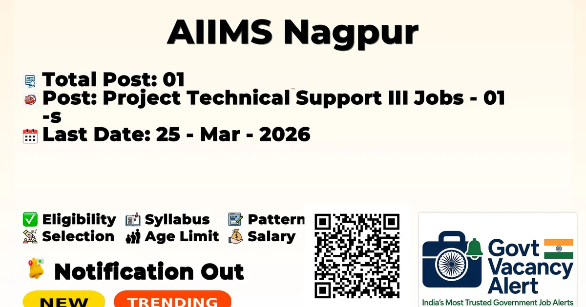 The All India Institute of Medical Sciences, Nagpur (AIIMS Nagpur) has officially released the notification to fill the vacancies of 01 Project Technical Support III Posts. Interested and eligibile candidates can use this opportunity to apply for these posts before the last date of application. Candidates who have completed their Any Degree, Post-graduation, B.E./B. Tech in Computer Science Engineering can apply for the AIIMS Nagpur Jobs 2026. The interested applicants can apply in online mode. Here we have mentioned the education details, age limit, selection process, application fee, salary, and how to apply for these posts before the deadline. The application dates have already begun.