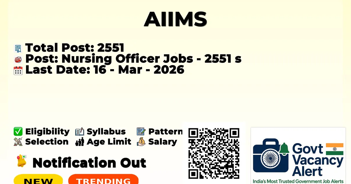 All India Institute of Medical Sciences (AIIMS) has declared the official notification for the recruitment or 2551 Nursing Officer Jobs. Those candidates who have qualified in the B.Sc Nursing, GNM, can grab this chance and apply for the AIIMS Recruitment 2026. Here we provided more details about the age limit, selection process, salary structure, education details, application fee, and how to apply for these posts. Interested candidates can apply online before the last date of application.