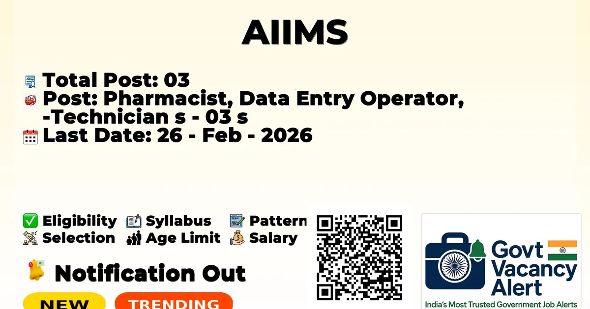 The All India Institute of Medical Sciences Jammu (AIIMS Jammu) has officially released the notification to fill the vacancies of 03 Pharmacist, Data Entry Operator, Technician Posts. Interested and eligibile candidates can use this opportunity to apply for these posts before the last date of application. Candidates who have completed their B. Pharm, D. Pharm, 12th, B.Sc., Diploma, or any degree can apply for the AIIMS Jammu Jobs 2026. The interested applicants can apply in online mode. Here we have mentioned the education details, age limit, selection process, application fee, salary, and how to apply for these posts before the deadline. The application dates have already begun.