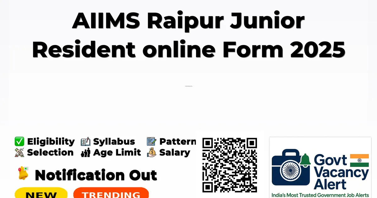 All India Institute of Medical Sciences Raipur (AIIMS Raipur) has released an official notification for the recruitment of 29 Junior Resident Posts. Interested and eligible candidates can apply Online through the official AIIMS Raipur website. The last date to submit the application form is 27-10-2025. In this article, you’ll find the AIIMS Raipur Junior Resident Posts recruitment details, including eligibility criteria, age limit, salary structure, selection process, application steps, and direct links to the official notification and Online application form.