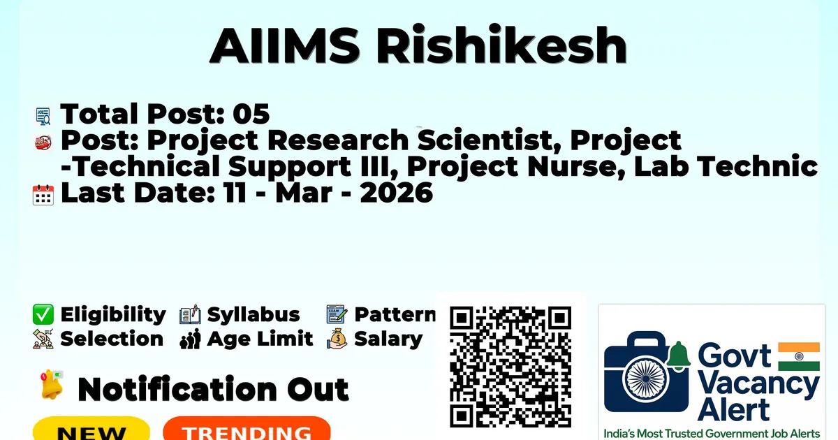 The All India Institute of Medical Sciences, Rishikesh (AIIMS Rishikesh) has officially released the notification to fill the vacancies of 05 Project Research Scientist, Project Technical Support III, Project Nurse, Lab Technician, and Field Worker Jobs. Interested and eligibile candidates can use this opportunity to apply for these posts before the last date of application. Candidates who have completed their MBBS, BDS, BHMS, BAMS, ANM, DMLT, 12th, or any degree can apply for the AIIMS Rishikesh Jobs 2026. The interested applicants can apply in offline mode. Here we have mentioned the education details, age limit, selection process, application fee, salary, and how to apply for these posts before the deadline. The application dates have already begun.
