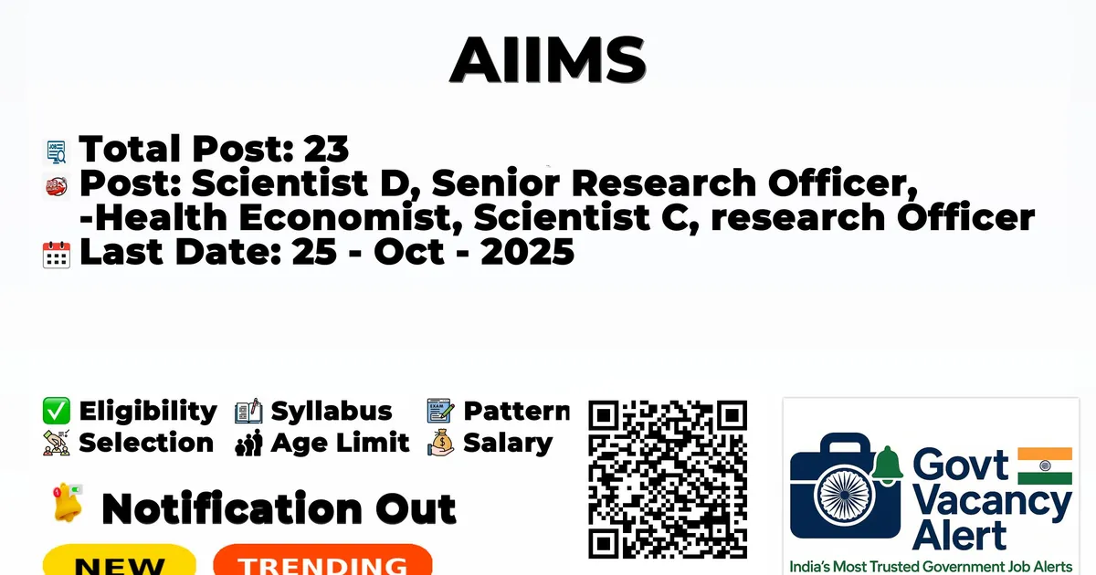 AIIMS — Scientist D, Senior Research Officer, Health Economist, Scientist C, research Officer, Admnistrative Officer Jobs - 23 Posts