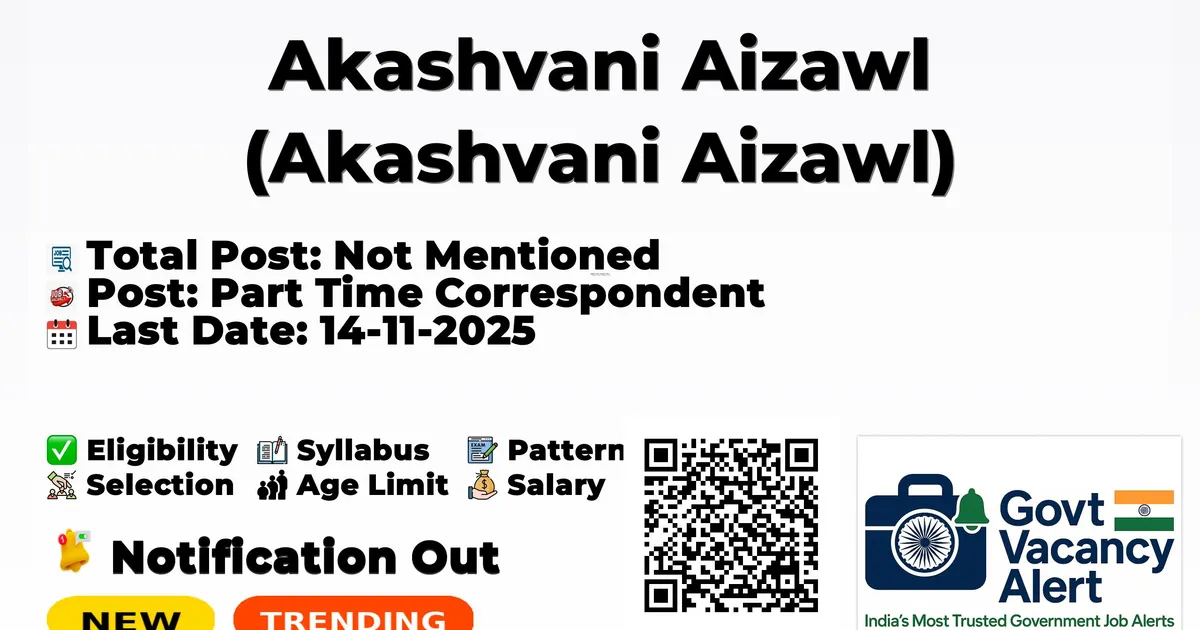 Akashvani Aizawl has released an official notification for the recruitment of Part Time Correspondent Posts. Interested and eligible candidates can apply Offline through the official Akashvani Aizawl website. The last date to submit the application form is 14-11-2025. In this article, you’ll find the Akashvani Aizawl Part Time Correspondent Posts recruitment details, including eligibility criteria, age limit, salary structure, selection process, application steps, and direct links to the official notification and Offline application form.