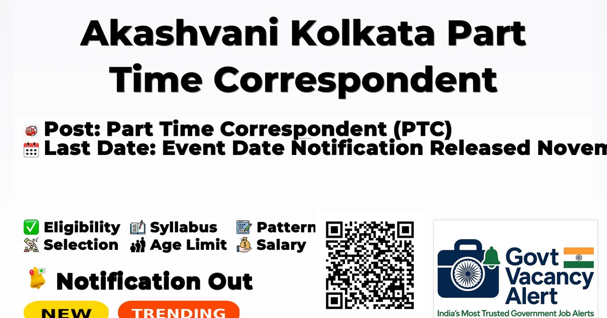 Prasar Bharati All India Radio (Akashvani Kolkata) has released an official notification for the recruitment of 10 Part Time Correspondent Posts. Interested and eligible candidates can apply Offline through the official Akashvani Kolkata website. The last date to submit the application form is 15-12-2025. In this article, you’ll find the Akashvani Kolkata Part Time Correspondent Posts recruitment details, including eligibility criteria, age limit, salary structure, selection process, application steps, and direct links to the official notification and Offline application form.